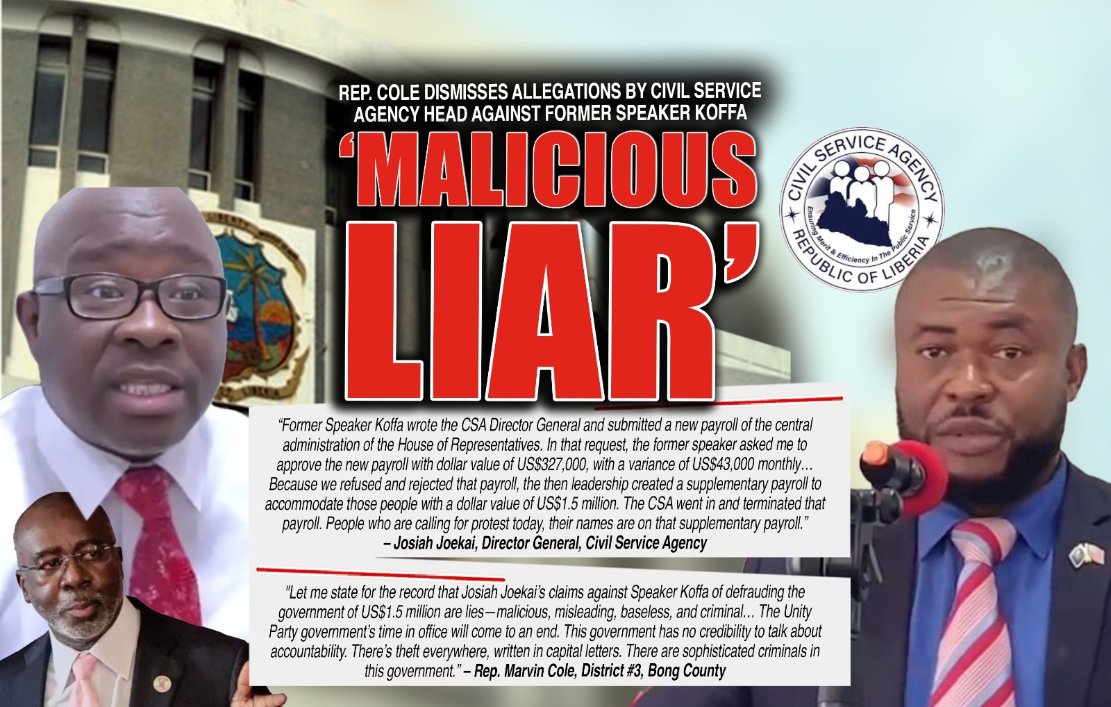 As of now, neither former Speaker Koffa nor the current House leadership under Speaker Richard Koon has officially responded to Joekai’s allegations or Rep. Cole’s defense. However, close allies of Koffa have hinted at possible legal action against the CSA Director-General, accusing him of character assassination and defamation.
