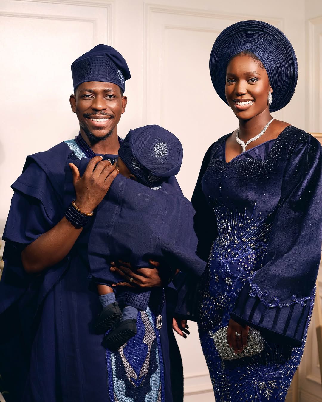 Moses matched her style and elegance in a navy blue agbada with bold blue and silver embroidery across the front. He paired it with a matching fìlà and traditional beaded necklaces that added a regal touch to his look.